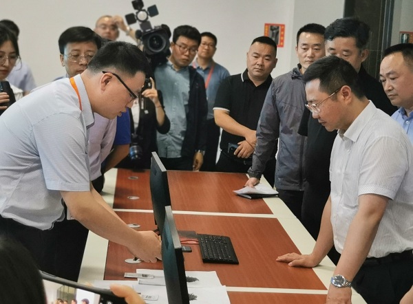2020年5月19日,遵義市委副書記、市長黃偉,遵義市人大副主任田剛,遵義市政協(xié)副主席、湄潭縣委書記魏在平,湄潭縣縣長李勰等相關領導蒞臨貴州遵義茶葉交易中心考察AI鑒真識別與溯源技術在湄潭茶產業(yè)中的應用,新立訊公司人員陪同考察。