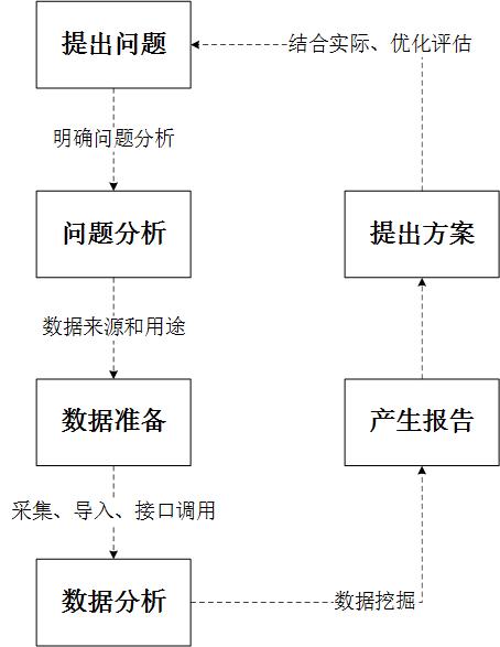 利用大數(shù)據(jù)進(jìn)行分析,大致是需要六個(gè)過(guò)程,提出問(wèn)題——問(wèn)題分析——數(shù)據(jù)準(zhǔn)備——數(shù)據(jù)分析——產(chǎn)生報(bào)告——提出方案,大數(shù)據(jù)分析,主要是圍繞這六個(gè)進(jìn)行開(kāi)展。